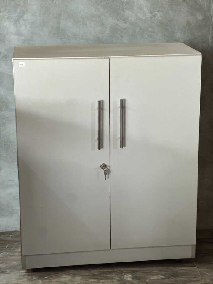 This sturdy cabinet features two doors with vertical handles and a secure locking mechanism. Finished in white, it’s perfect for organizing documents, supplies, or personal items.